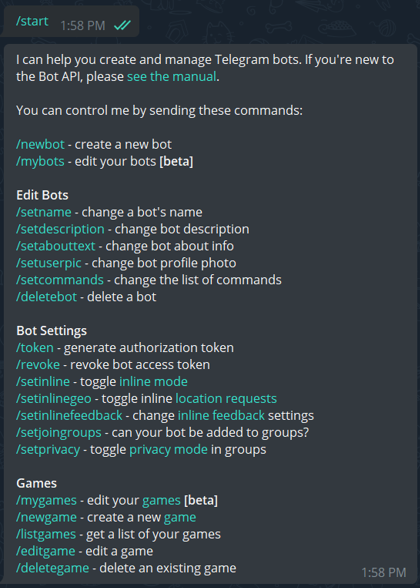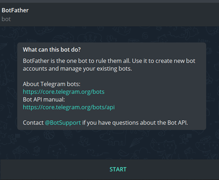 <figure><img src="https://content.gitbook.com/content/q3QSrBULrPPYb4ulf7mJ/blobs/h2dxZR4btovngftO0Ui9/image.png" alt=""><figcaption><p>BotFather</p></figcaption></figure>