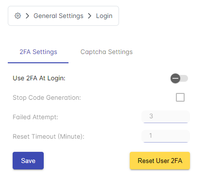 <figure><img src="https://1296629390-files.gitbook.io/~/files/v0/b/gitbook-x-prod.appspot.com/o/spaces%2Fq3QSrBULrPPYb4ulf7mJ%2Fuploads%2FbzBfO7hksLZJvHZTMUkP%2Fimage.png?alt=media&#x26;token=1cb6a0e7-203e-442f-a5a5-9bd751fb6f93" alt=""><figcaption><p>2FA Settings</p></figcaption></figure>